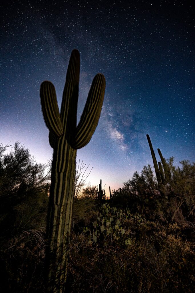 Sedona, con sus vórtices energéticos, combina estrellas y bienestar. El Gran Cañón desde la Desert Watchtower es uno de los lugares más impresionantes para ver la Vía Láctea. Tucson, con el Parque Nacional del Saguaro, ofrece cactus gigantes bajo la bóveda celeste.
